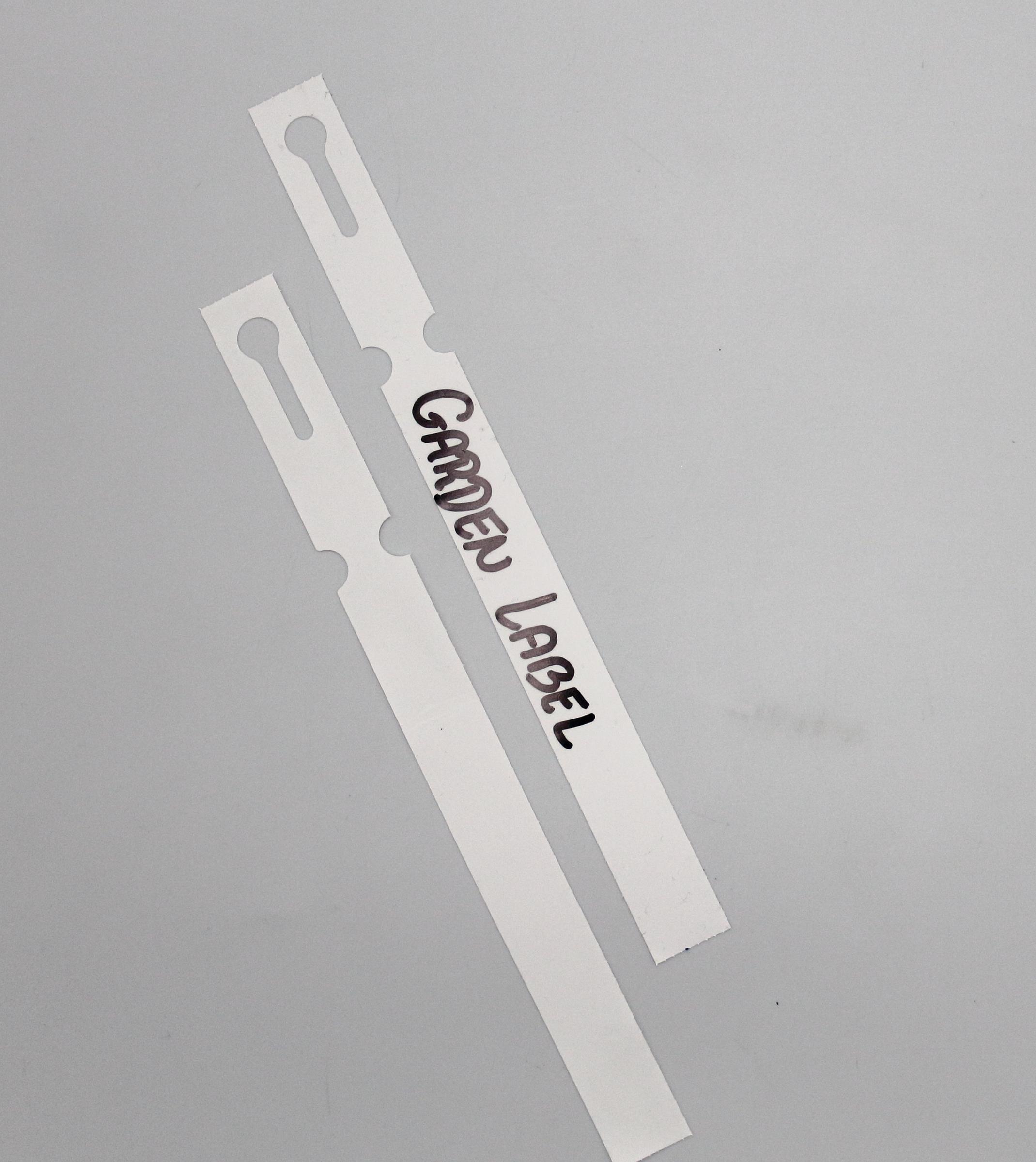 Profesjonalne etykiety ogrodnicze wykonane z trwałego HDPE o wymiarach 250x17mm (17×250), przeznaczone do druku termotransferowego oraz opisywania markerem permanentnym.