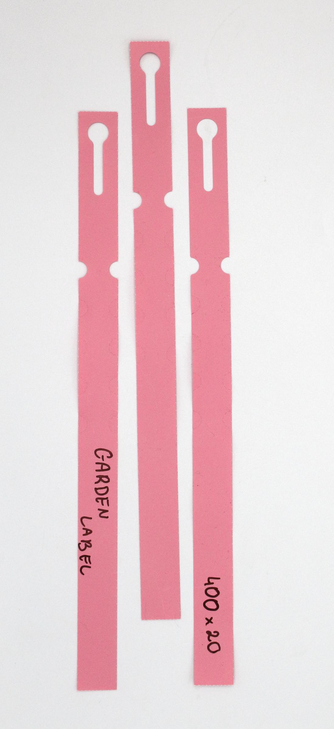 Profesjonalne etykiety ogrodnicze wykonane z trwałego HDPE o wymiarach 400×20 mm (20×400), przeznaczone do opisywania markerem permanentnym.