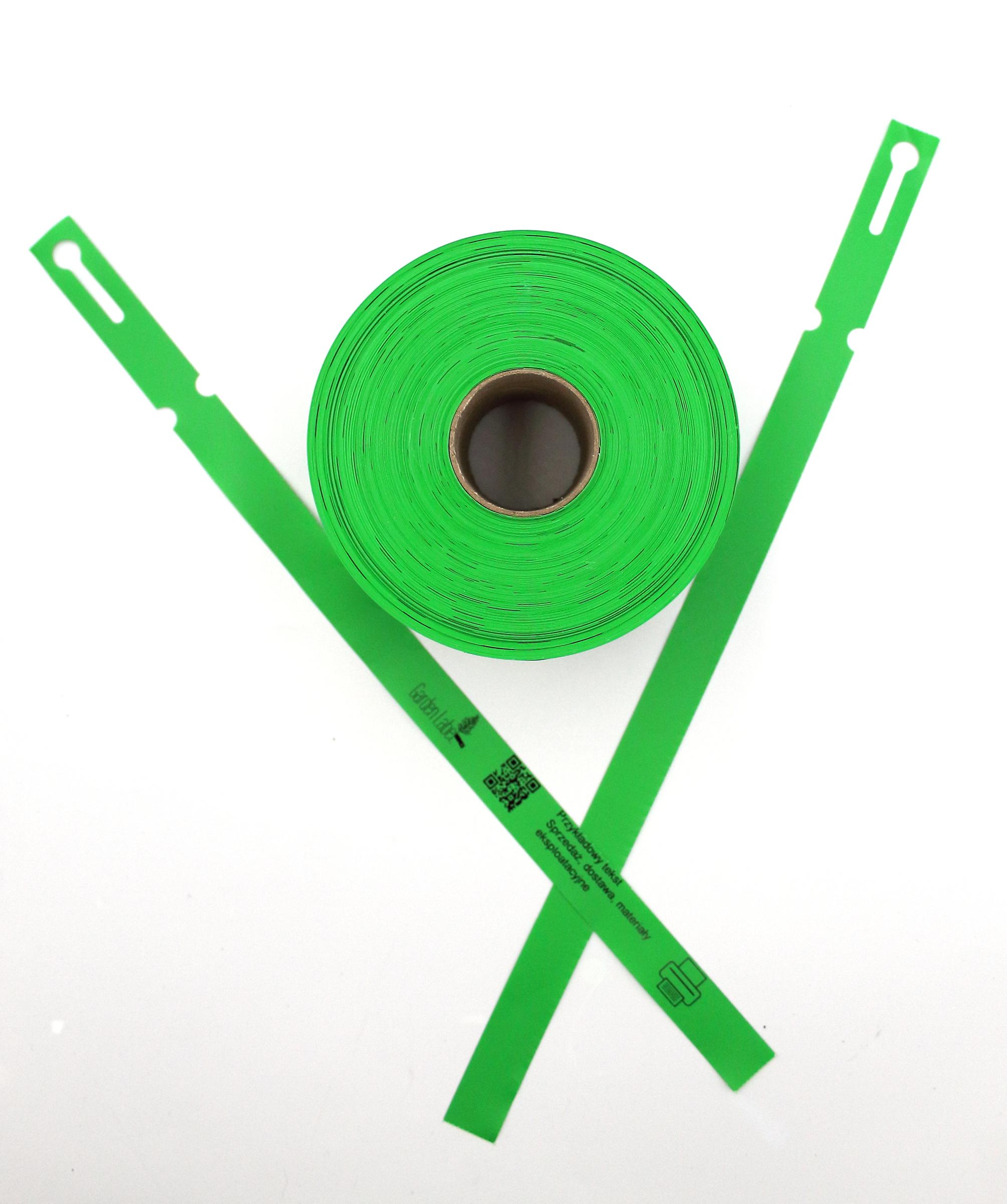 Wytrzymała etykieta pętlowa (wiązana, pętelkowa, regulowana) o wymiarach 400×20 mm (20×400), wykonana z odpornego na warunki atmosferyczne tworzywa HDPE – odporna na deszcz, promieniowanie UV i zmienne temperatury. Przeznaczona do drukarek termotransferowych oraz opisu permanentnym markerem.
