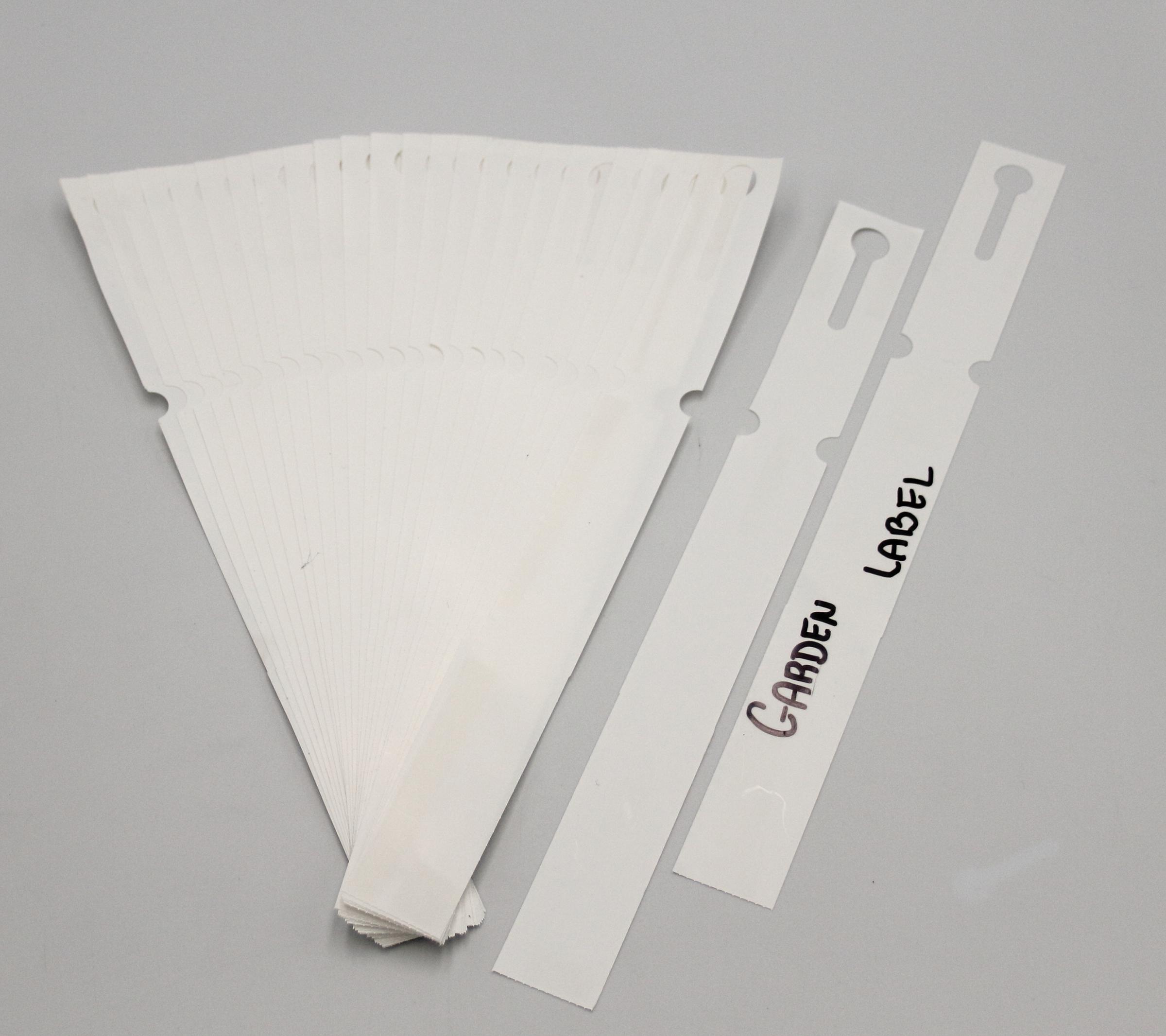 Profesjonalne etykiety ogrodnicze wykonane z trwałego HDPE o wymiarach 250x25mm (25×250), przeznaczone do druku termotransferowego oraz opisywania markerem permanentnym.