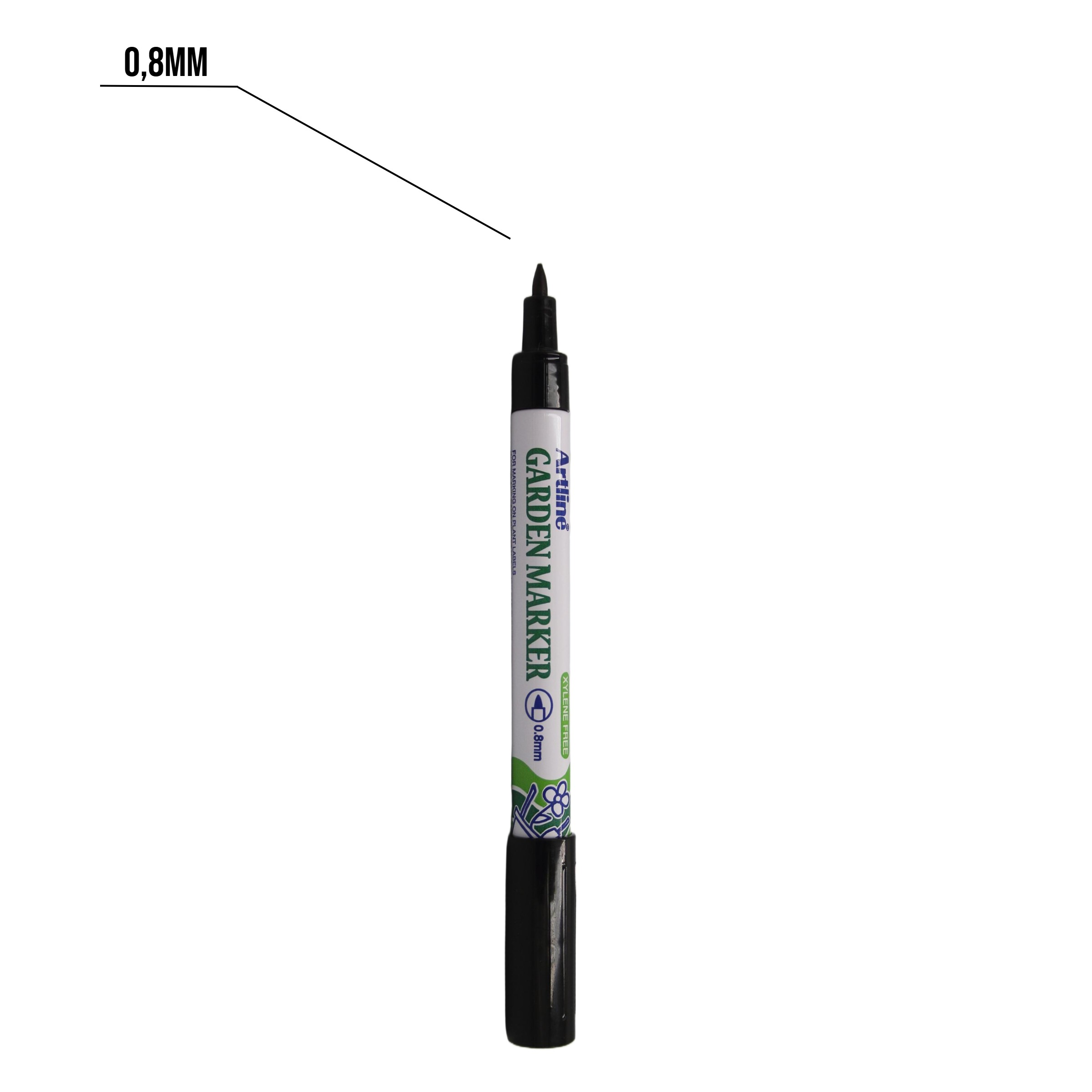 Permanentny czarny marker przeznaczony do trwałego opisania etykiet ogrodniczych. Wygodny w użyciu. Tusz wysycha natychmiastowo. Odporny na ścieranie, wilgoć oraz działania czynników zewnętrznych. Wytrzymały i wodoodporny .Fibrowa okrągła końcówka, 0 ,8 mm (szerokość linii). ,Dostępne kolory: czarny.