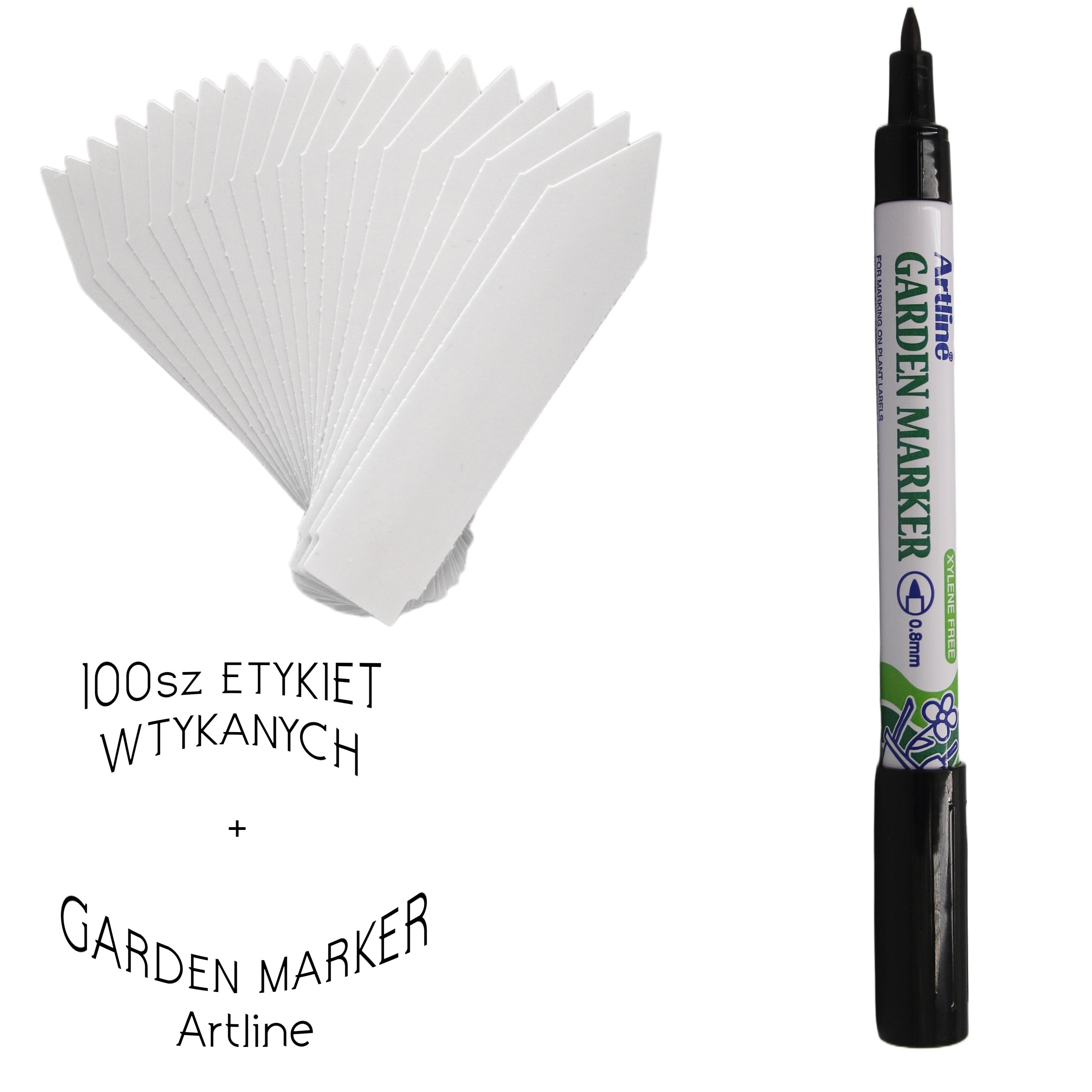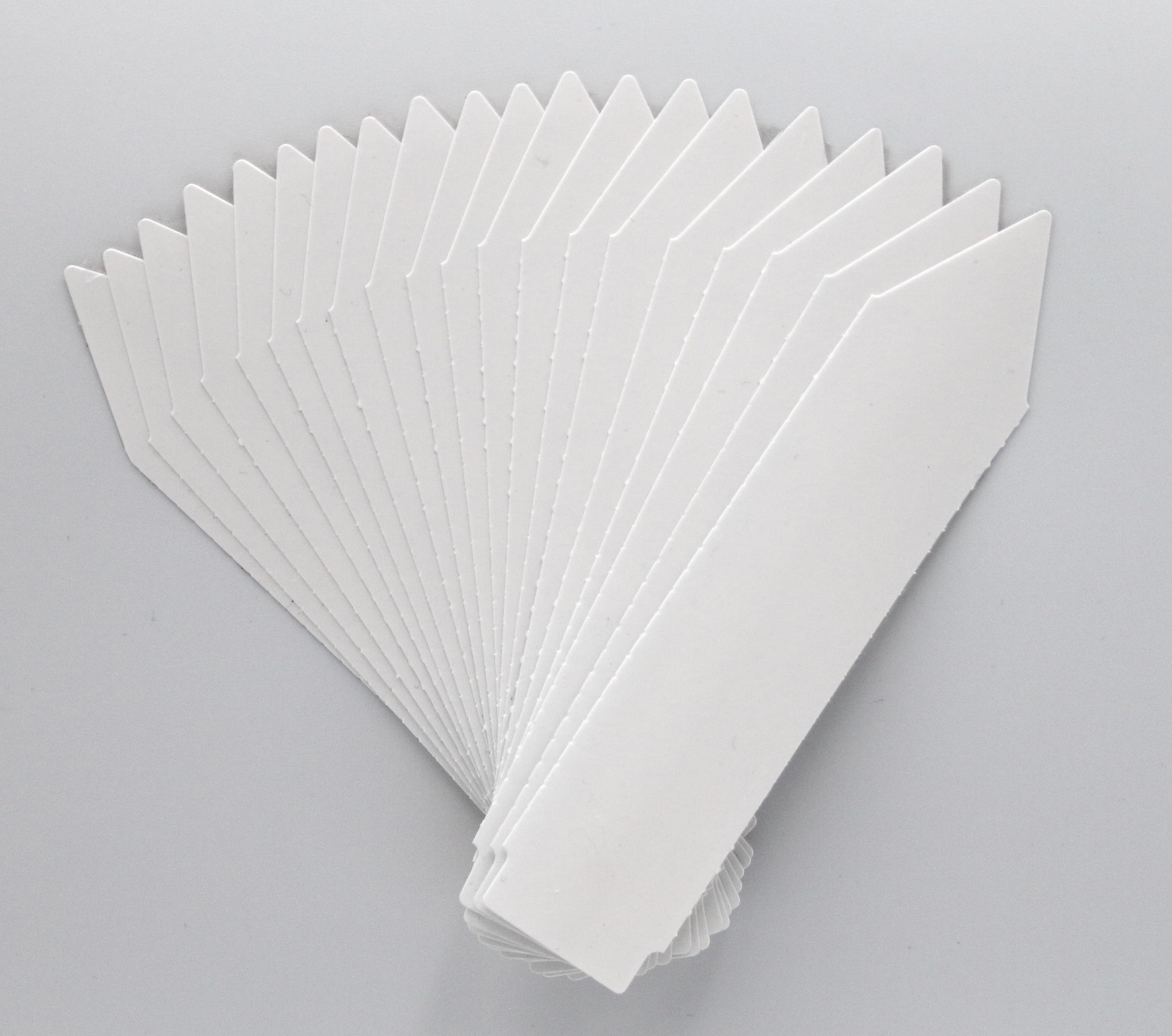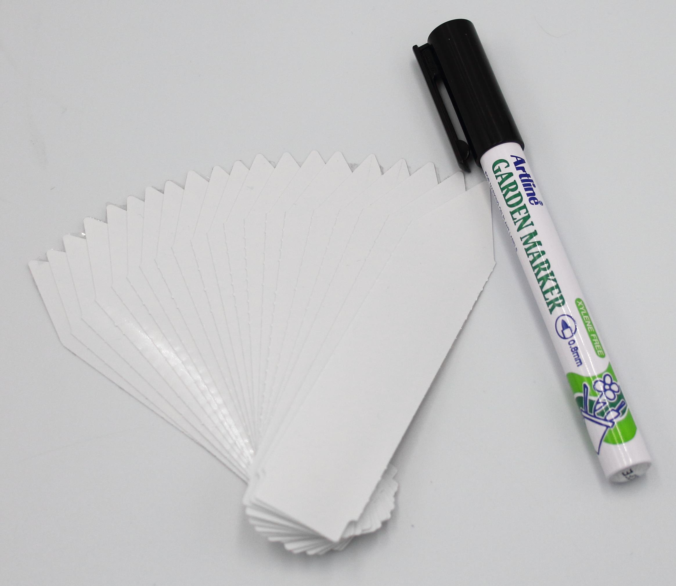 MARKER + Etykiety ogrodnicze wtykane strzałki w kolorze białym to doskonałe rozwiązanie do oznaczania roślin w każdym ogrodzie, szkółce czy w warunkach rolniczych. Oferowane etykiety mają wymiary 100 mm x 20,5 mm i są dostępne w opakowaniu zawierającym 100 sztuk. Wykonane z trwałego materiału PVC, charakteryzują się grubością 250 mikronów, co zapewnia ich wysoką odporność na niekorzystne warunki atmosferyczne, takie jak deszcz czy promieniowanie UV. Dzięki temu informacje umieszczone na etykietach pozostaną czytelne przez długi czas.
