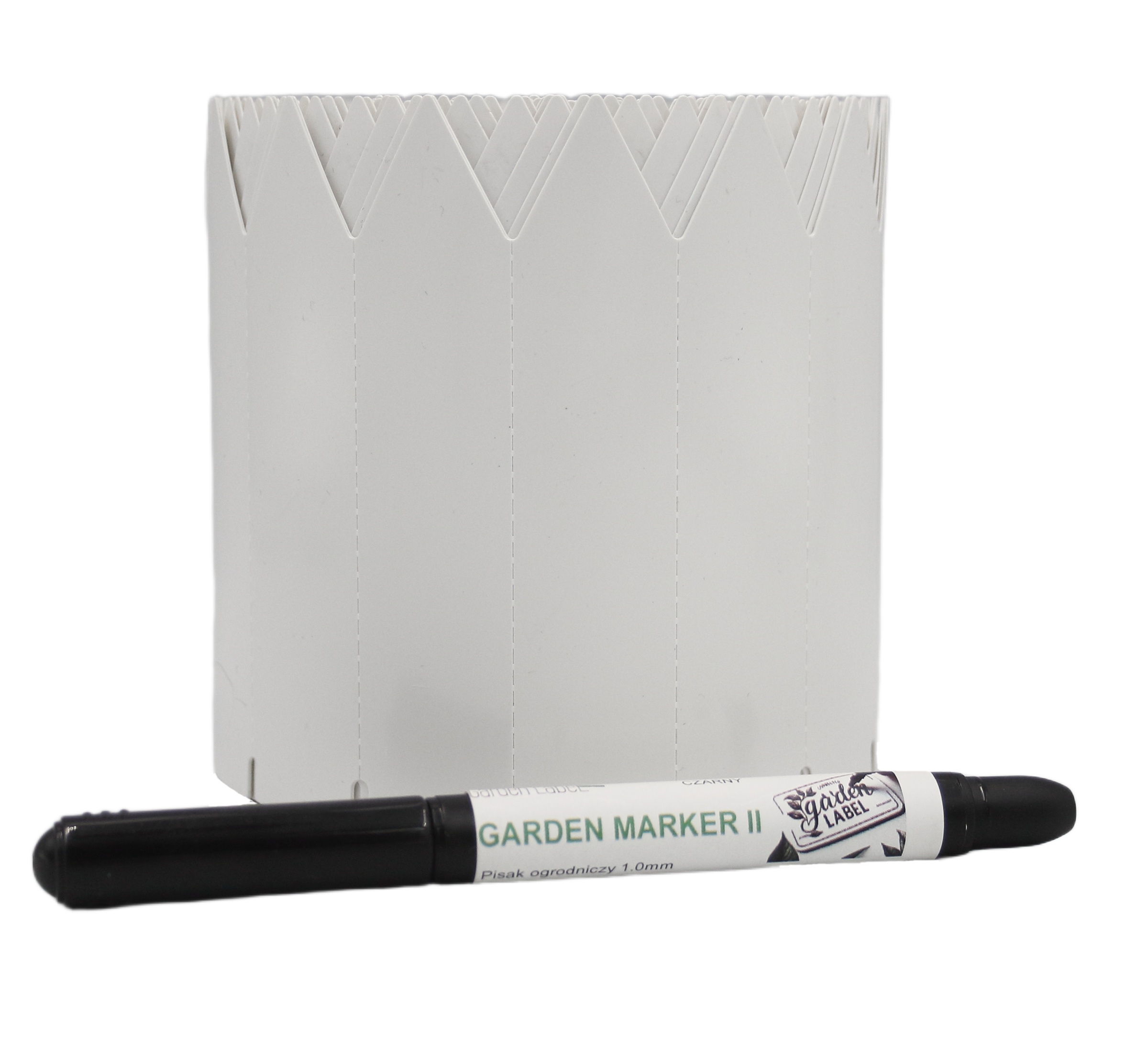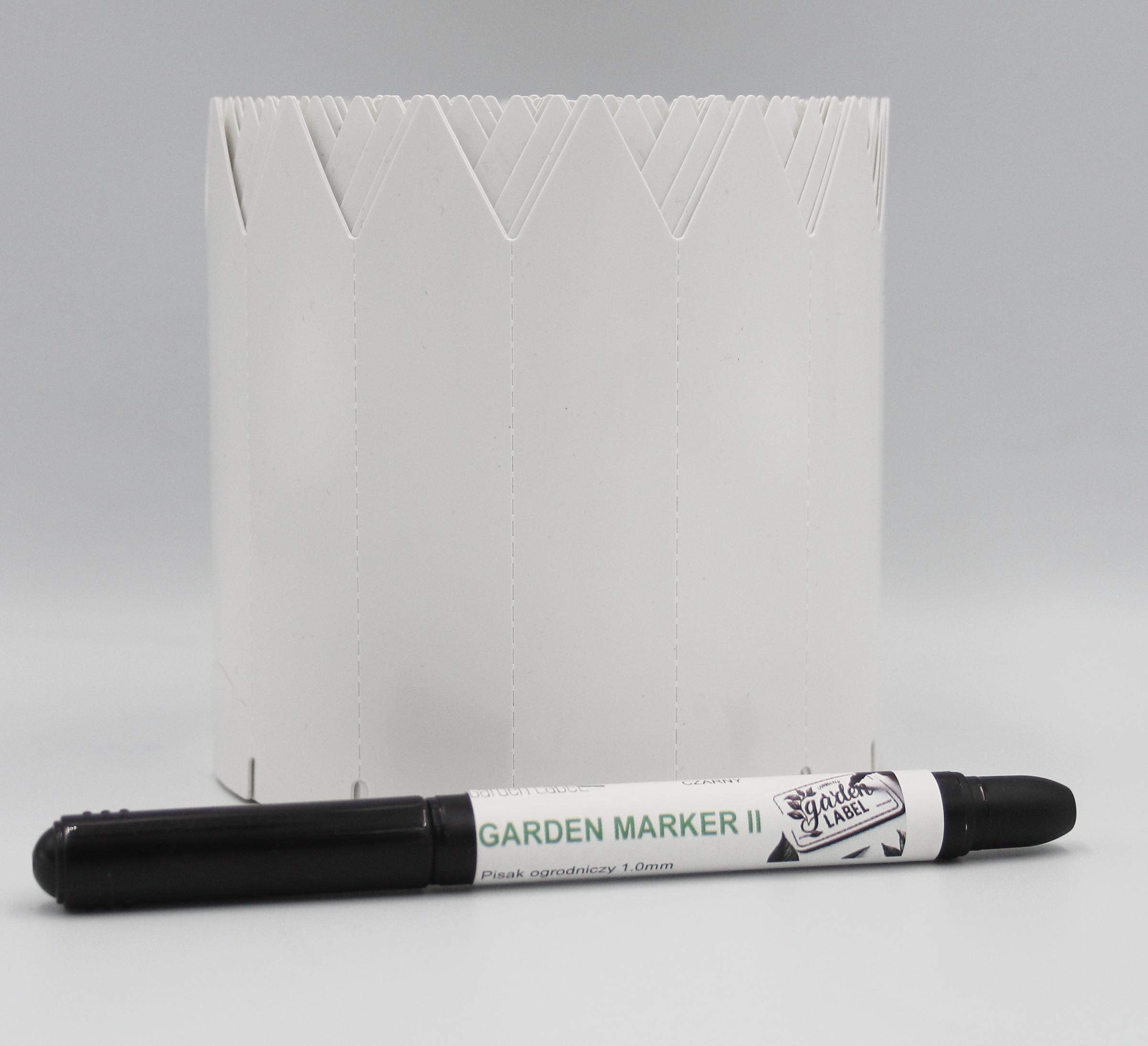 MARKER II + Etykiety ogrodnicze wtykane to niezbędny element każdego ogrodu, szkółki czy uprawy roślinnej. Nasze etykiety o wymiarach 105 mm x 23,5 mm wykonane są z wytrzymałego materiału PVC, co zapewnia ich długotrwałość i odporność na warunki atmosferyczne. Białe etykiety są idealne do oznaczania zarówno roślin doniczkowych, jak i tych sadzonych w gruncie. Dzięki jednostronnej końcówce w formie strzałki, łatwo możesz je umieścić w ziemi, co jest szczególnie korzystne w przypadku sadzonek w multiplatach.