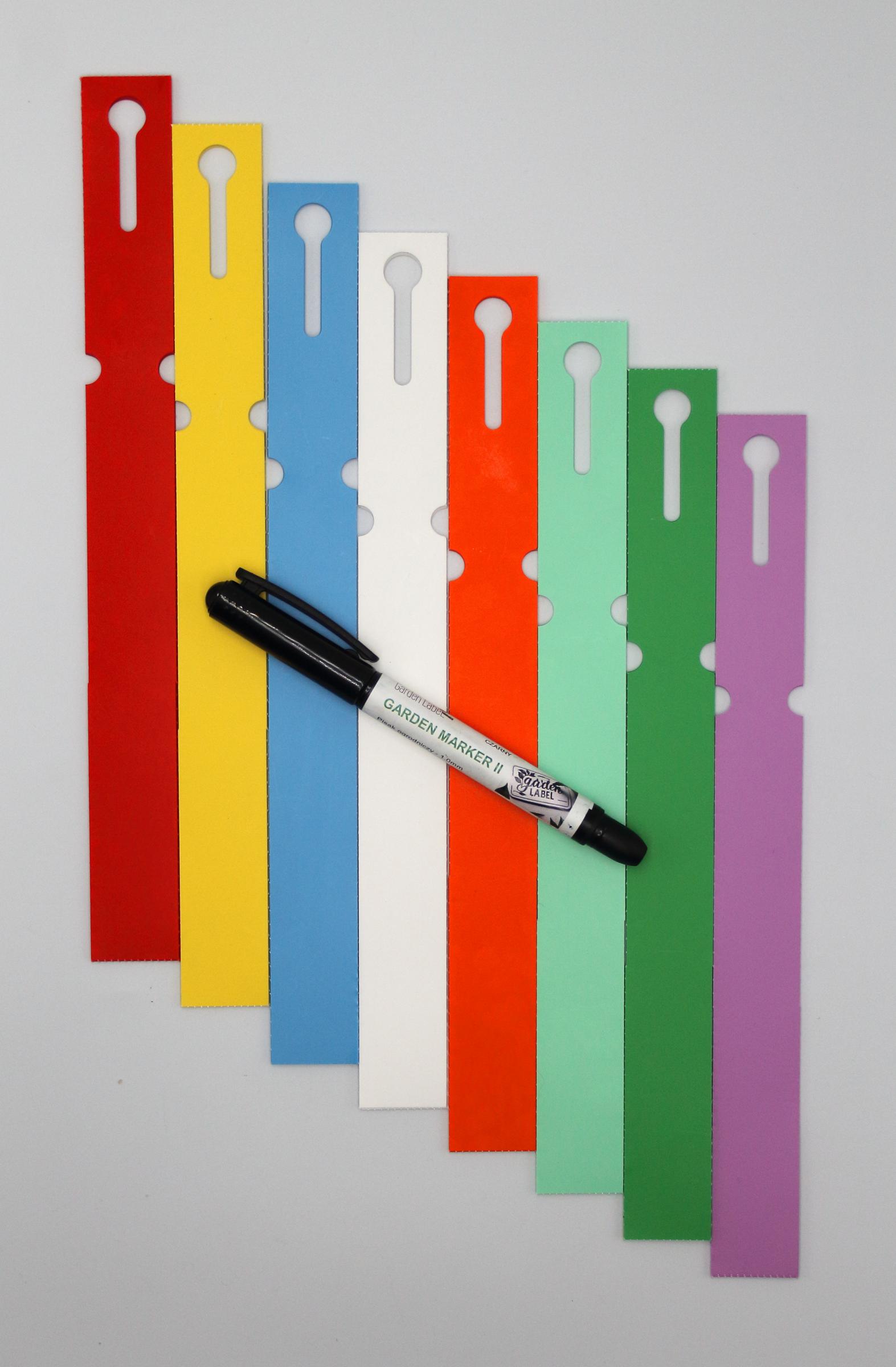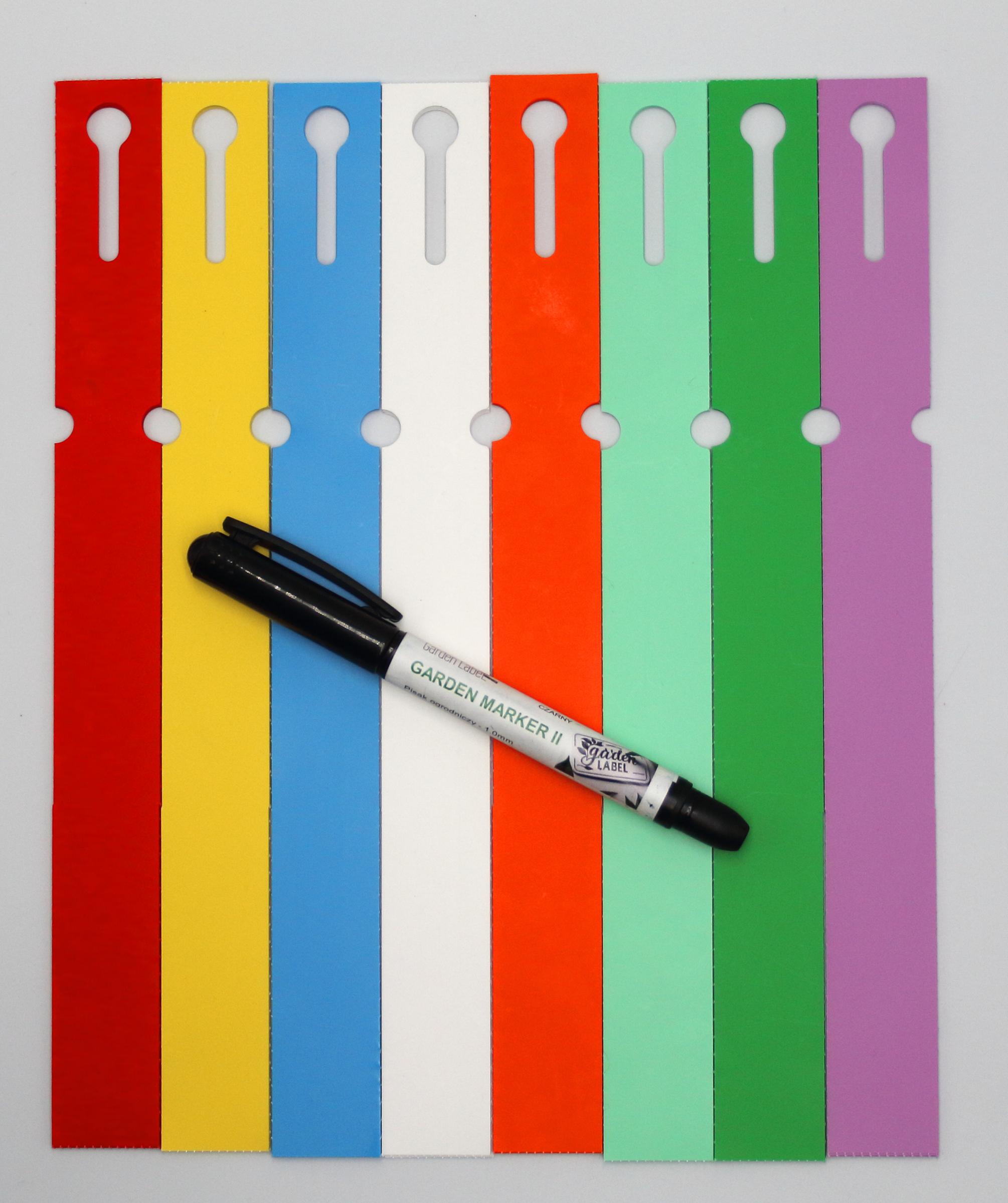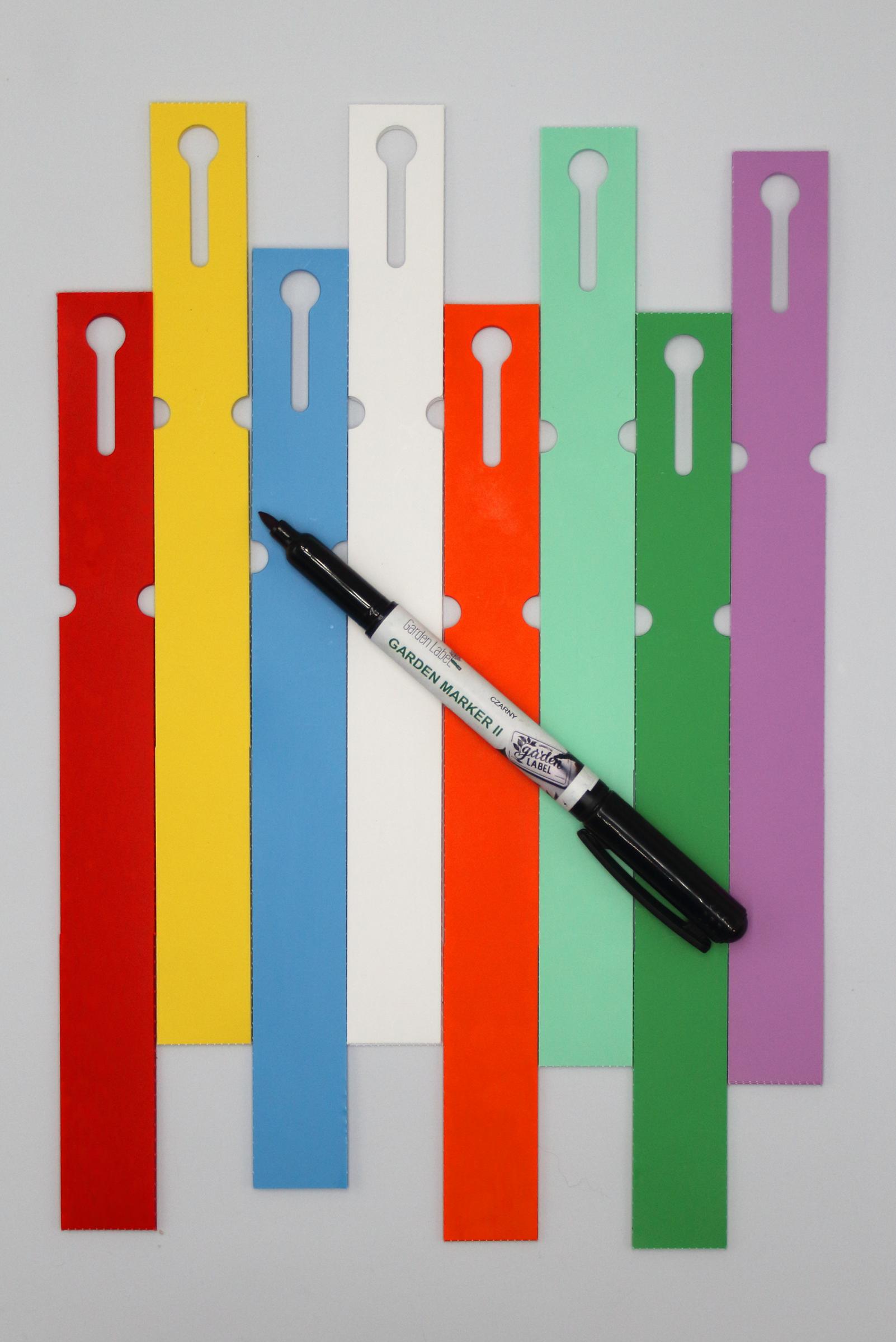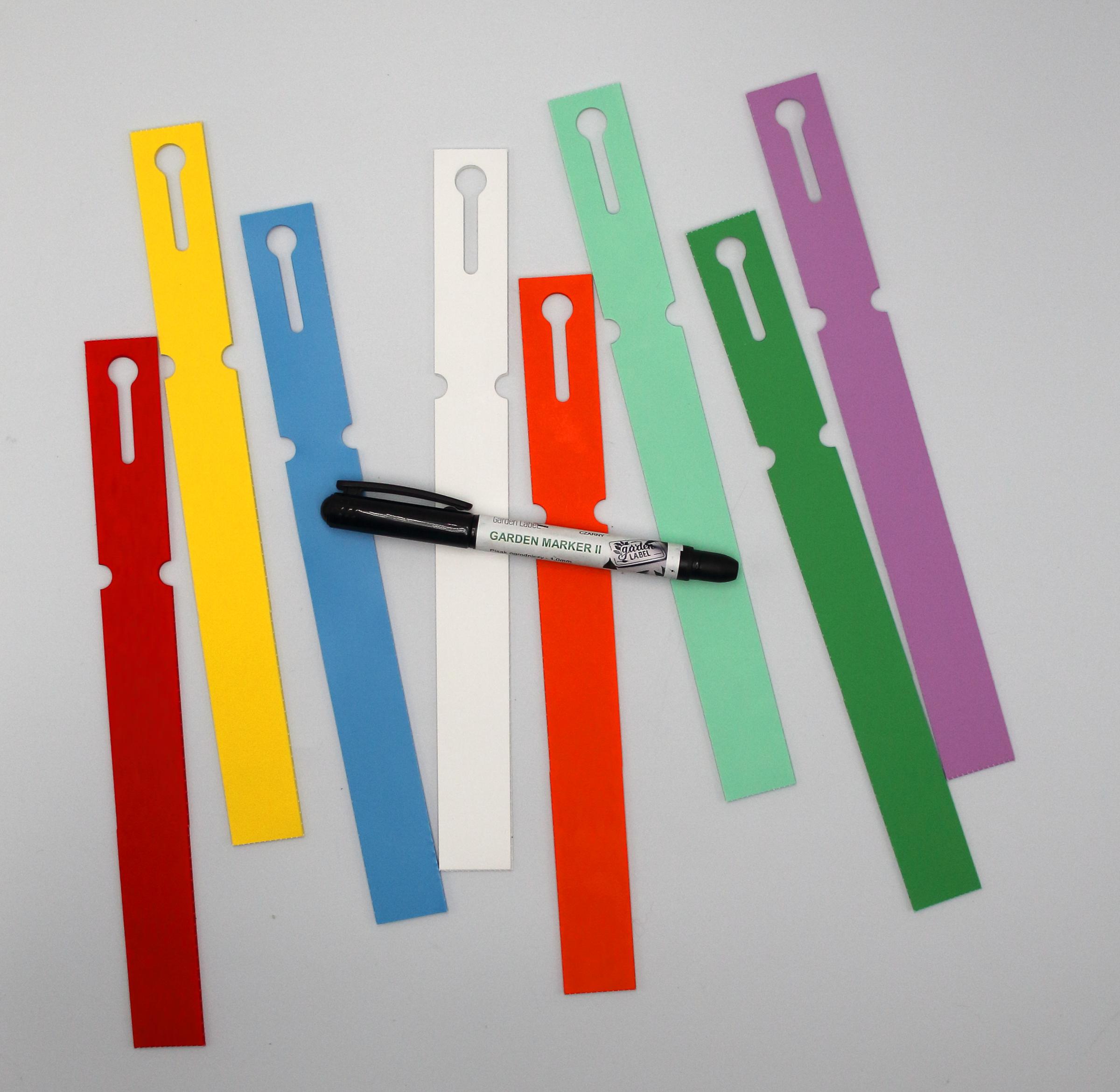 Profesjonalne etykiety ogrodnicze wykonane z trwałego HDPE o wymiarach 250×25 mm (25×250), przeznaczone do opisywania markerem permanentnym.