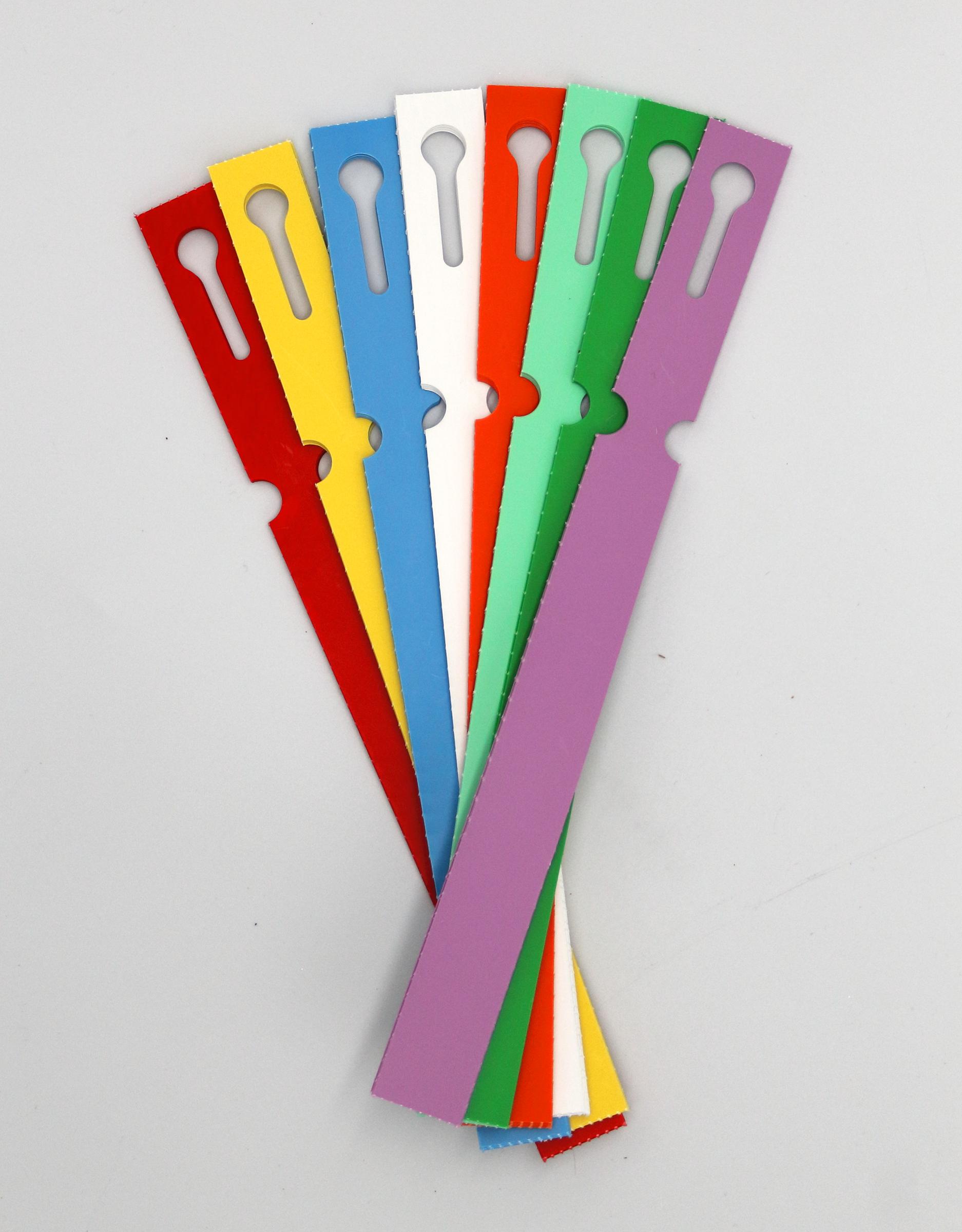 Gładka powierzchnia zapewnia trwałość i czytelność opisu w każdych warunkach. Dzięki elastycznemu kształtowi mocowanie jest szybkie i nie wymaga narzędzi.