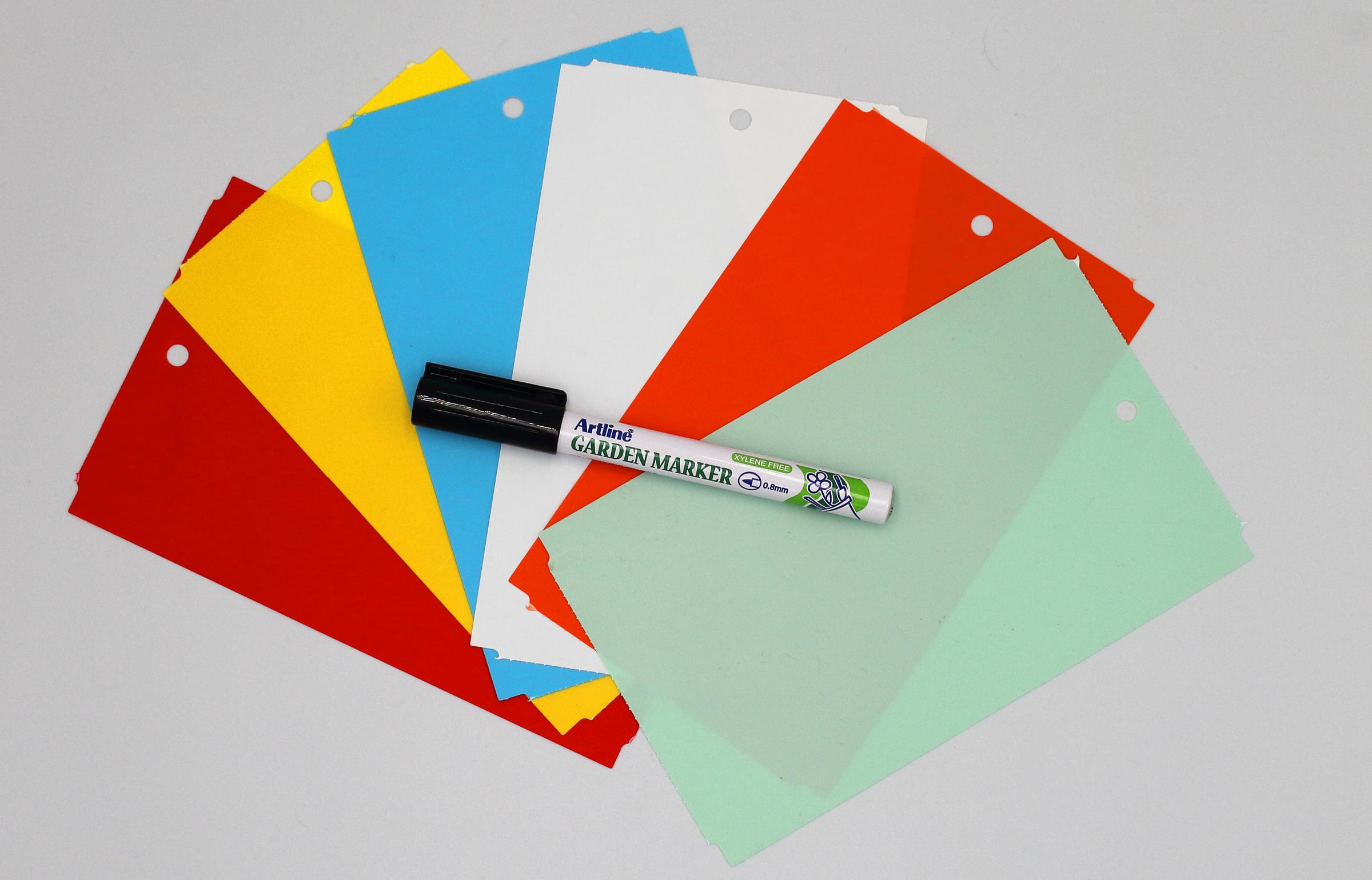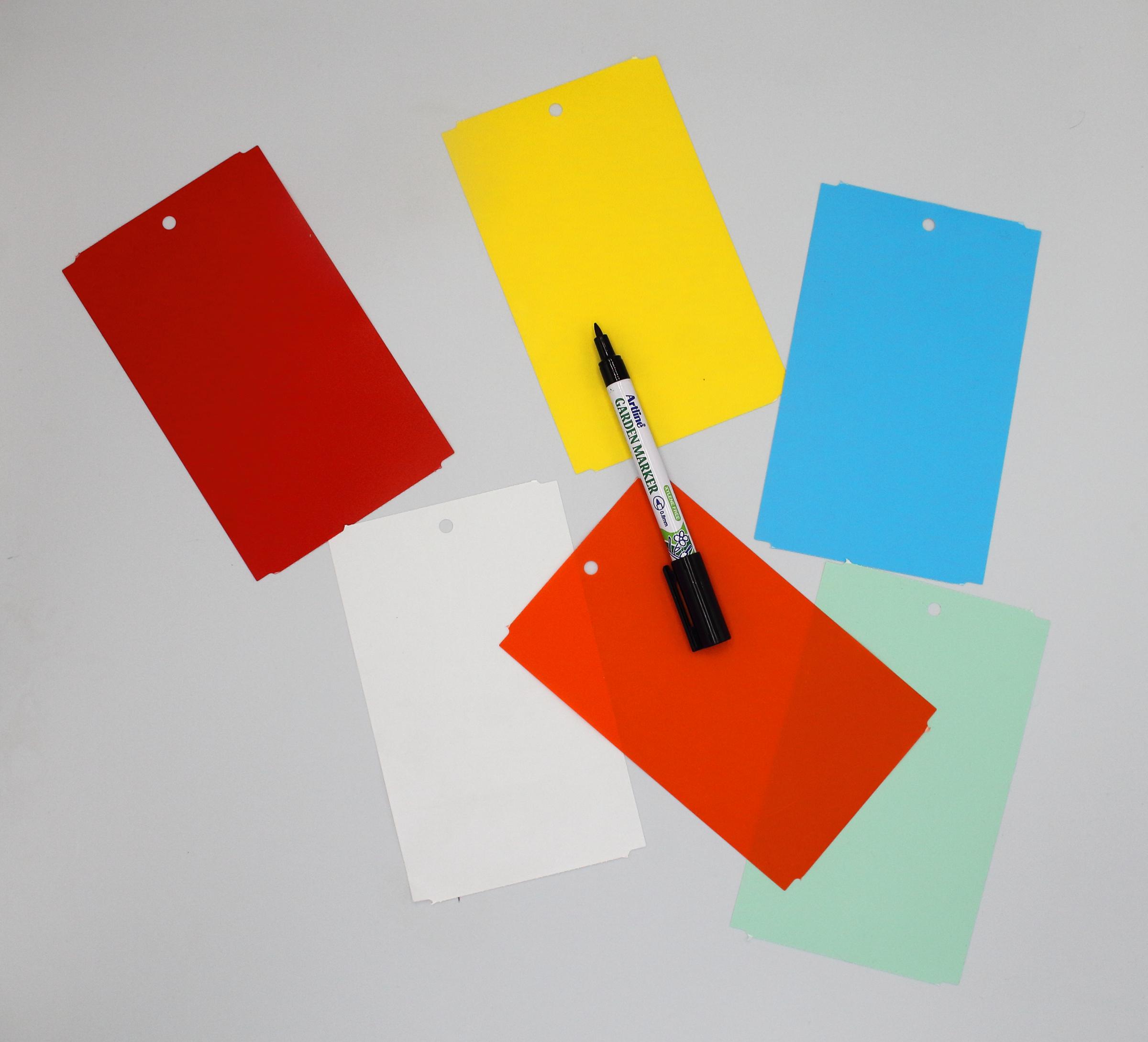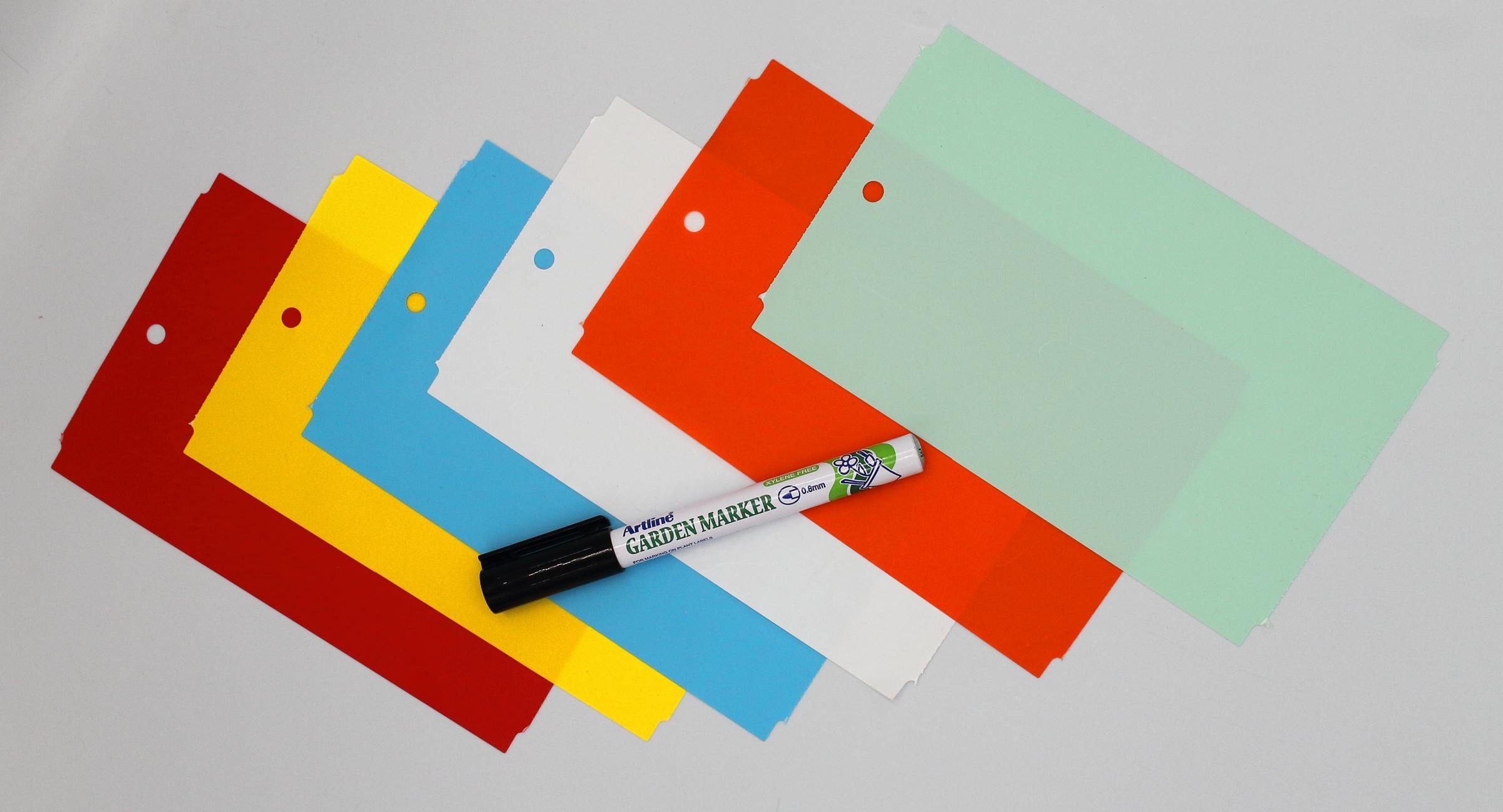MARKER + Kolorowe zawieszki o wymiarze 163,5x100m do roślin wykonane z trwałego tworzywa HDPE z certyfikatem dopuszczenia do kontaktu z żywnością. To profesjonalne etykiety ogrodnicze przeznaczone do trwałego znakowania roślin w szkółkach, centrach ogrodniczych, gospodarstwach ogrodniczych oraz w uprawach owoców i warzyw.