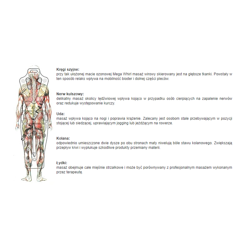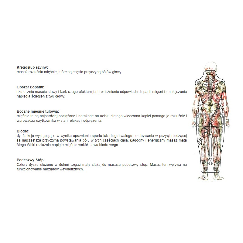 Dzięki dużym regulowanym i wymiennym dyszom, Mata MegaWhirl, doskonale masuje i wszelako oddziałuje na punkty receptorów odpowiedzialnych za napięcia mięśniowe, zastrzały, skurcze oraz dolegliwości bólowe.